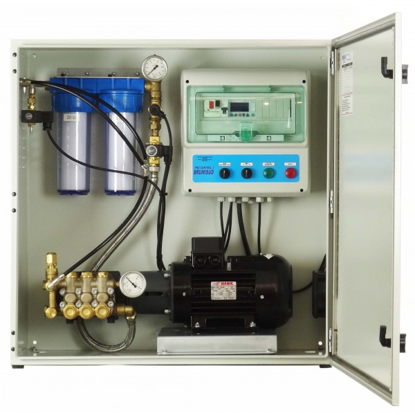 Armoire de brumisation industrielle haute pression gamme NMT complète prévu pour une utilisation intensive dans les applications les plus contraignantes et les plus exigeantes dans le milieu industriel, permettant d’alimenter différents types de brumisateurs: rampes de buse, brumiventilateurs, bornes fraicheur … L’ensemble des composants du système de brumisation est entièrement monté dans une armoire métallique étanche.Tous les éléments sont montés et fixés à l’intérieur de l’armoire, ils sont raccordés, câblés, réglés et testés dans nos ateliers en conditions réelles de fonctionnement. Le raccordement est rapide et simple, il s’effectue sur une arrivée d’eau à l’aide d’un flexible inox FF 3/4 (M) Long.1.5m, et un cordon d’alimentation 380V.