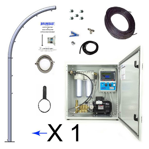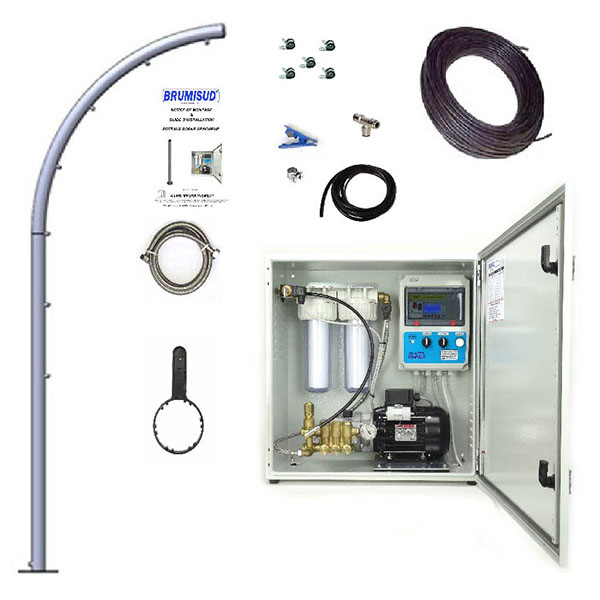 L’ensemble des composants du système de brumisation est entièrement monté dans une armoire métallique étanche. Tous les éléments pompe, coffret électrique, électrovanne, filtre …  sont montés et fixés, ils sont raccordés, câblés, réglés et testés dans nos ateliers en conditions réelles de fonctionnement. Le raccordement de la station HP est rapide et simple, il s’effectue sur une arrivée ou un robinet d’eau classique à l’aide d’un flexible inox FF 1/2 Long. 1.5m (fourni), ainsi qu’une prise électrique 230V.