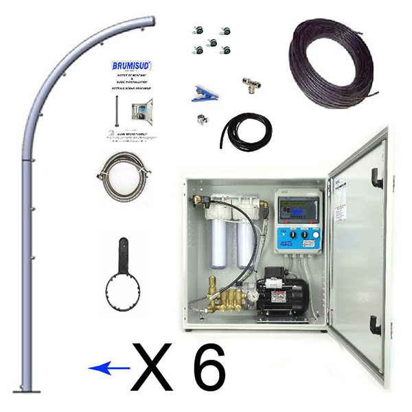 Système de brumisation haute pression complet comprenant tout le matériel nécessaire pour réaliser une installation de brumisation avec arches fraîcheur, solution idéale de brumisateur pour espaces publics. L’arche de buse est un systeme confortable et ludique pour la brumisation urbaine.
