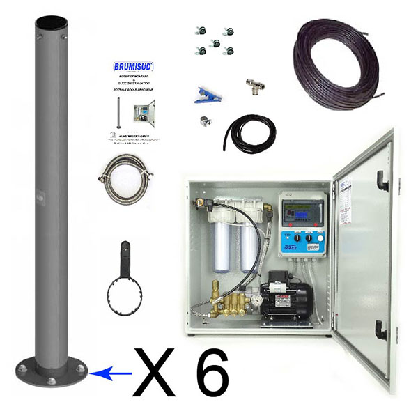 Système de brumisation haute pression complet comprenant tout le matériel nécessaire pour réaliser une installation de brumisation avec poteaux borne fraîcheur, solution idéale de brumisateur pour espaces publics. Le poteau borne fraicheur est un systeme confortable et ludique pour la brumisation urbaine.