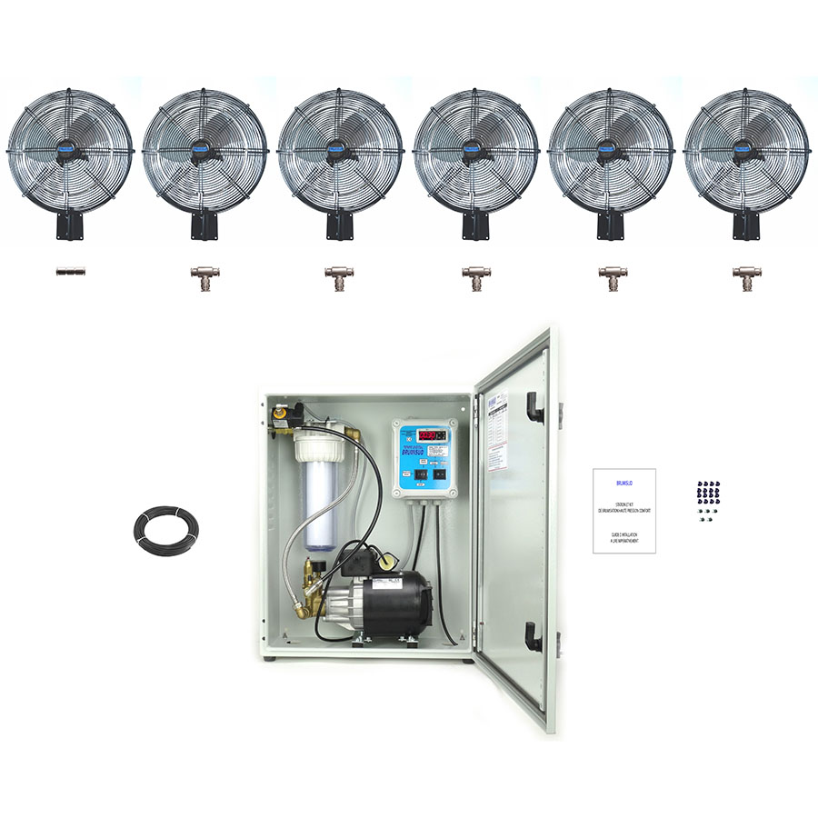Système de brumisation haute pression complet comprenant tout le matériel nécessaire pour réaliser une installation de brumisation avec brumiventilateurs sur supports mural. Chaque appareil doit être raccordé sur une prise de courant 230V.