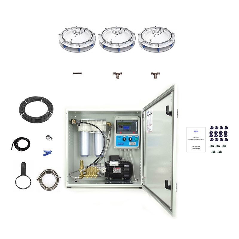 Système de brumisation haute pression complet comprenant tout le matériel nécessaire pour réaliser une installation de brumisation avec brumisateurs ventilateurs 360 SKY FOG. Chaque appareil doit être raccordé sur une prise de courant 230V.