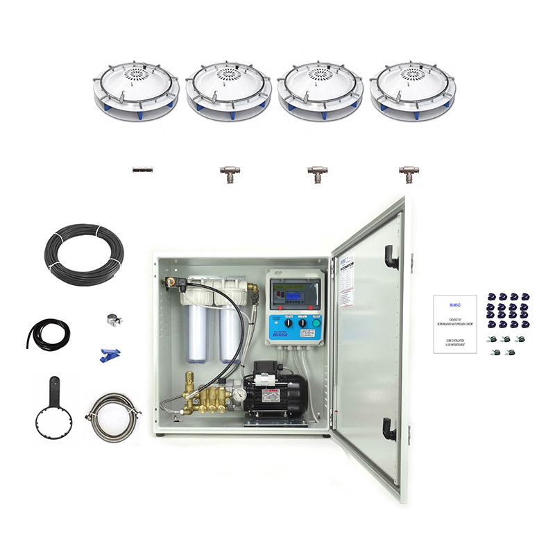Système de brumisation haute pression complet comprenant tout le matériel nécessaire pour réaliser une installation de brumisation avec brumisateurs ventilateurs 360 SKY FOG. Chaque appareil doit être raccordé sur une prise de courant 230V.