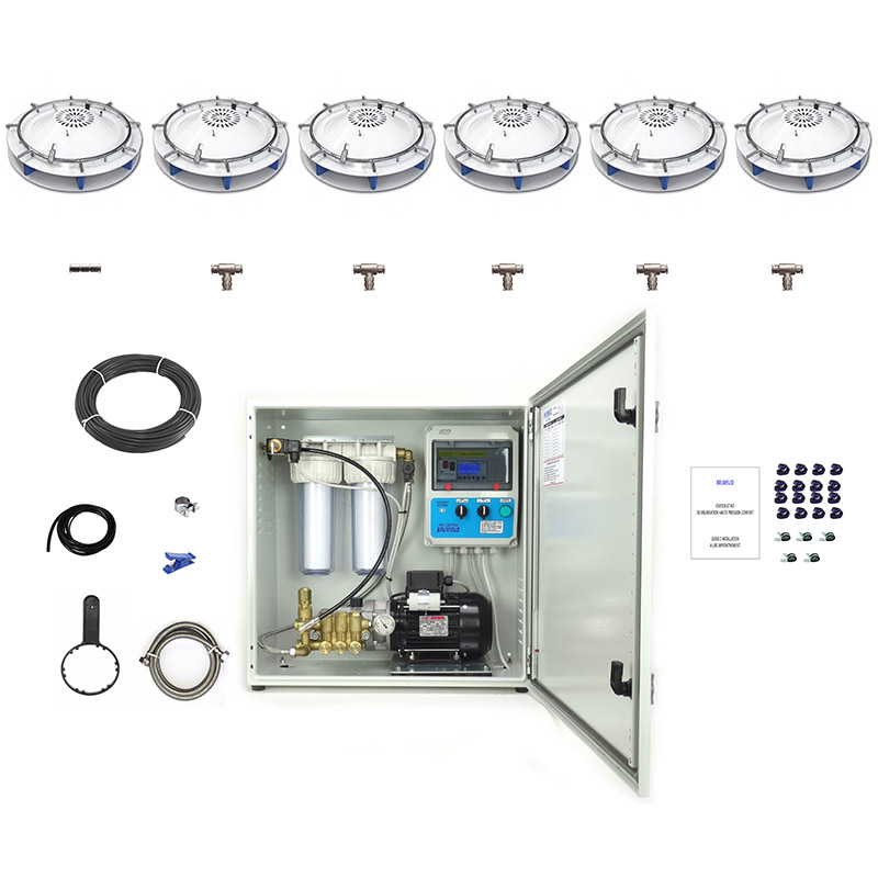 Système de brumisation haute pression complet comprenant tout le matériel nécessaire pour réaliser une installation de brumisation avec brumisateurs ventilateurs 360 SKY FOG. Chaque appareil doit être raccordé sur une prise de courant 230V.