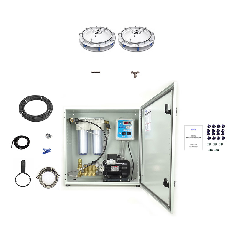Système de brumisation haute pression complet comprenant tout le matériel nécessaire pour réaliser une installation de brumisation avec brumisateurs ventilateurs 360 SKY FOG. Chaque appareil doit être raccordé sur une prise de courant 230V.