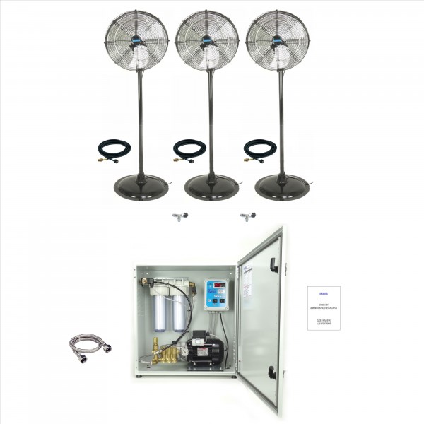 Système de brumisation haute pression complet comprenant tout le matériel nécessaire pour réaliser une une installation démontable de brumisation avec brumiventilateurs sur pied. Chaque appareil doit être raccordé sur une prise de courant 230V.