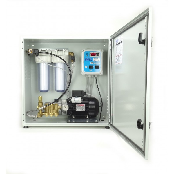 L’ensemble des composants du système de brumisation est entièrement monté dans une armoire métallique étanche. Tous les éléments pompe, coffret électrique, électrovanne, filtre … sont montés et fixés, ils sont raccordés, câblés, réglés et testés dans nos ateliers en conditions réelles de fonctionnement. Le raccordement de la station HP est rapide et simple, il s’effectue sur une arrivée ou un robinet d’eau classique à l’aide d’un flexible inox FF 1/2 Long. 1.5m (fourni), ainsi qu’une prise électrique 230V.