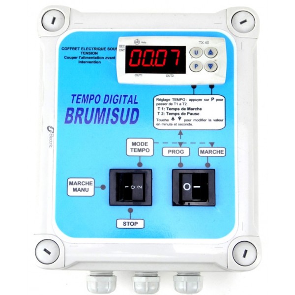 Coffret de Commande TEMPO DIGITAL 230V, Il possède une double temporisation séquentielle réglable à la seconde qui permet de régler les temps de fonctionnement et de pause du système. Boitier qui intègre afficheur digital, boutons manu/auto, programmation, protection thermique, contacteur, boitier étanche 193 x 164, livré avec prise et câble d’alimentation de 3M.