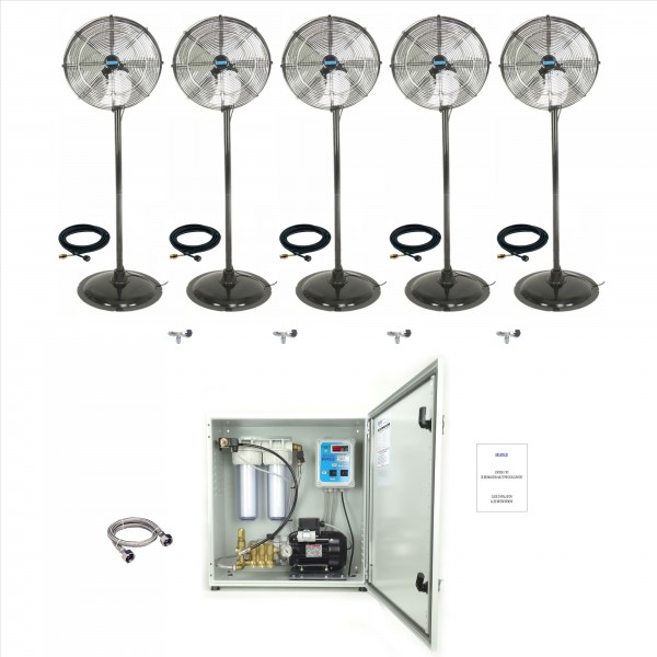 Système de brumisation haute pression complet comprenant tout le matériel nécessaire pour réaliser une une installation démontable de brumisation avec brumiventilateurs sur pied. Chaque appareil doit être raccordé sur une prise de courant 230V.