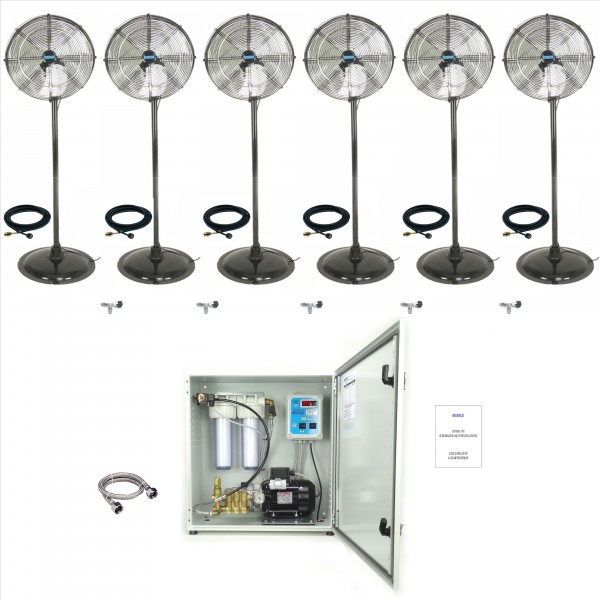 Système de brumisation haute pression complet comprenant tout le matériel nécessaire pour réaliser une une installation démontable de brumisation avec brumiventilateurs sur pied. Chaque appareil doit être raccordé sur une prise de courant 230V.