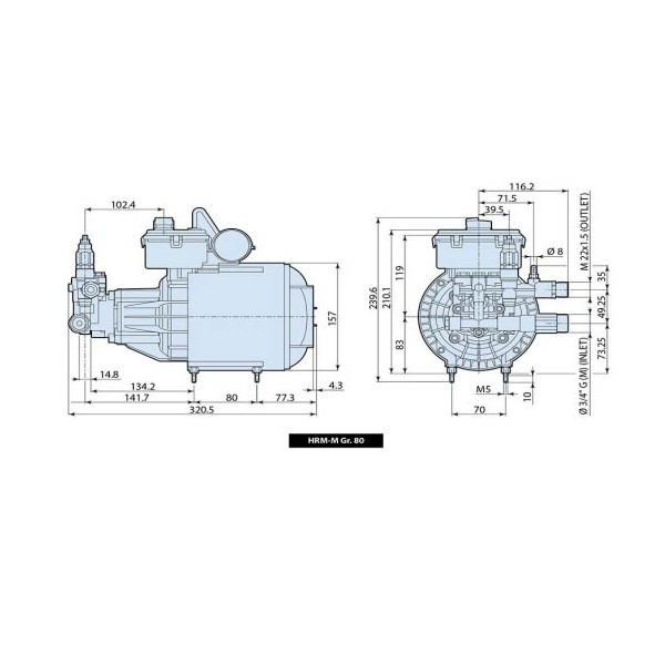 Groupe haute pression haute pression a technologie AXIALE ensemble monobloc, pompe haute pression axiale,  tête en laiton, pistons plongeurs en inox, pression de service 60 Bars – 70 maxi, entraînement direct, moteur 230V – 1450 Tr/min, régulateur de pression et manométre de contrôle, sortie HP G1/4