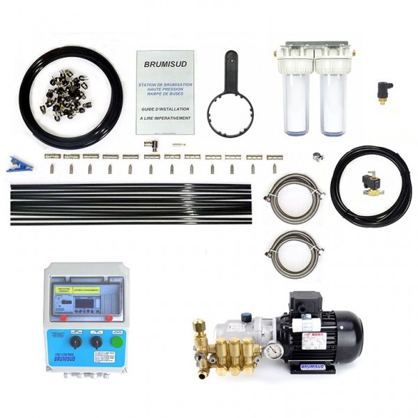 Système de brumisation haute pression BRUMISUD complet comprenant tout le matériel nécessaire pour réaliser une installation de rampe de buses. L’ensemble des composants du système de brumisation est entièrement monté dans une armoire métallique étanche. Tous les éléments pompe, coffret électrique, électrovanne, filtre … sont montés et fixés, ils sont raccordés, câblés, réglés et testés dans nos ateliers en conditions réelles de fonctionnement. Le raccordement de la station HP est rapide et simple, il s’effectue sur une arrivée ou un robinet d’eau classique à l’aide d’un flexible inox FF 1/2 Long. 1.5m (fourni), ainsi qu’une prise électrique 230V. Montage facile des rampes et mise en place rapide des buses grâce aux raccords rapides instantanés (montage sans outils).