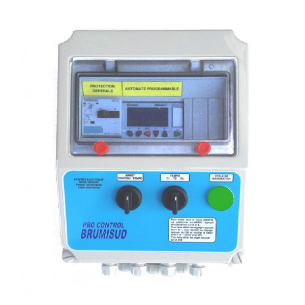 Coffret de Commande PRO CONTROL 230V, Il est prés-programmé par automate, avec une sélection rapide de 3 cycles de temporisation séquentielle enregistré selon les besoins, qui permet de régler les temps de fonctionnement et de pause du système. Fonctions : Purge automatique, Compteur horaire, Programmation. Boitier qui intègre disjoncteur thermique, contacteur, bornes d’asservissement externe. Façade avec un large écran d’affichage 4 lignes, 1 voyant de contrôle, 2 boutons de commande fonction manu/arrêt/auto et cycle 1-2-3. Boitier étanche, 285 x 222, livré avec prise et câble d’alimentation de 3M.